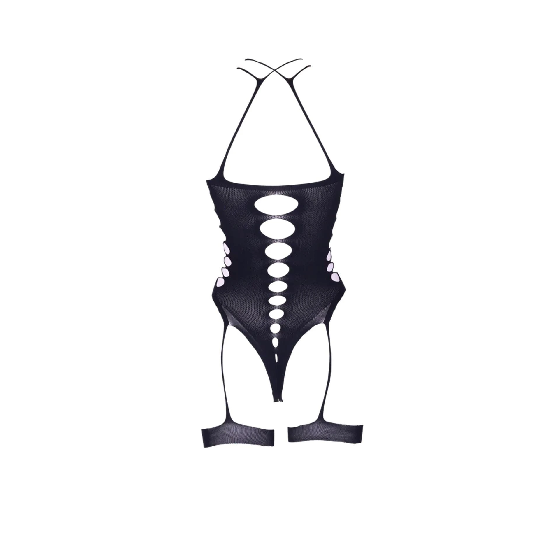 Siateczkowy wzór subtelnie modeluje talię, a otwarte wycięcia z tyłu przyciągają spojrzenia dokładnie tam, gdzie chcesz — na kusząco wyeksponowane pośladki. Krzyżowany dekolt pięknie podkreśla linię biustu, a starannie rozmieszczone paski zapewniają komfort i doskonałe ułożenie w okolicach szyi.