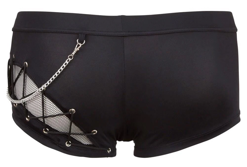 Spodnie wykonane są z efektownego połączenia materiału kryjącego oraz transparentnej siateczki typu fishnet, co tworzy intrygujący kontrast i podkreśla sylwetkę. Z przodu znajduje się zamek błyskawiczny, a całość uzupełnia odpinany, dekoracyjny łańcuszek, dodający charakteru i nowoczesnego akcentu. Czarny kolor oraz wysoka elastyczność materiału zapewniają komfort noszenia i doskonałe dopasowanie.
