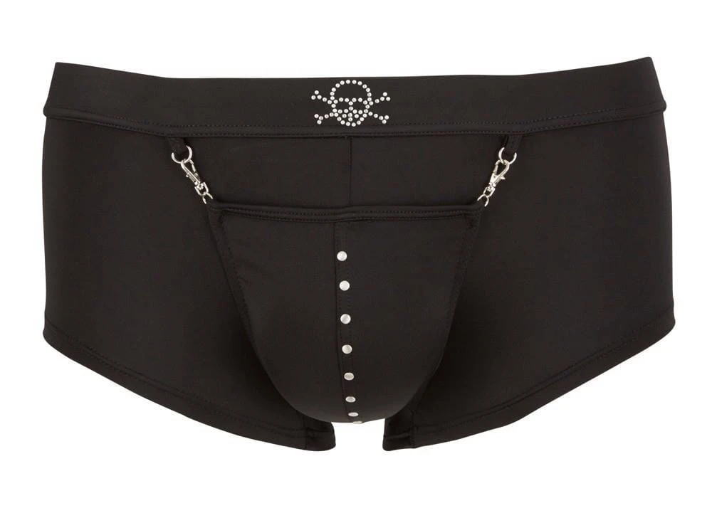 Dopasowany krój podkreśla sylwetkę, a piracka stylistyka nadaje całości charakteru i pazura. Model wyposażony jest w praktyczną kieszeń z karabińczykiem, a także w funkcję podkreślenia przodu, która wzmacnia efekt wizualny. W pasie znajduje się nitowana ozdoba w kształcie czaszki, dodająca autentycznego, buntowniczego akcentu.