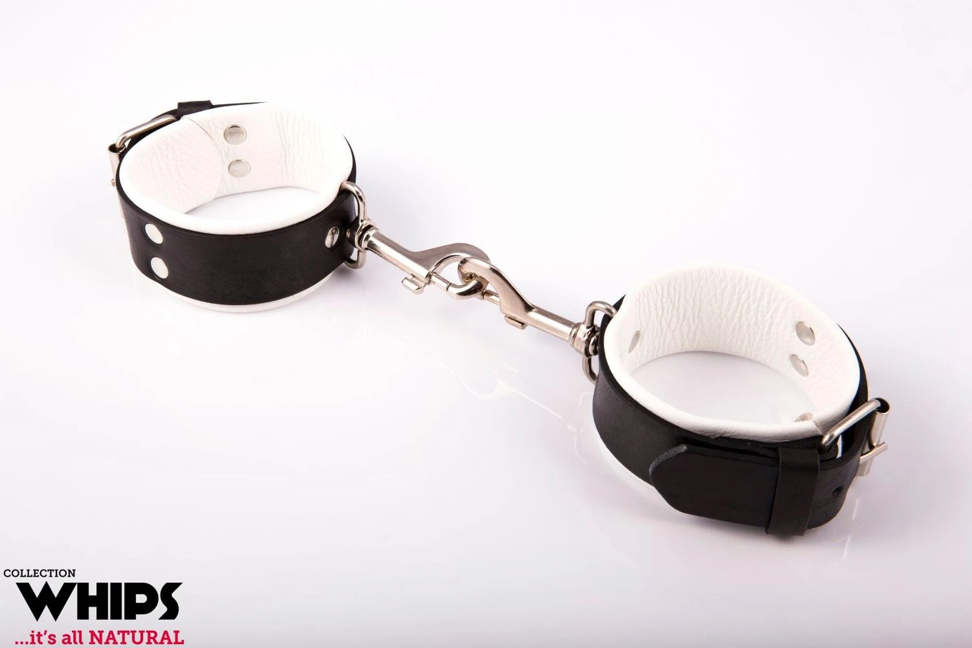 Skórzane kajdanki w kolorzebiało-czarnym zapinane na masywne klamry. Możliwość regulacji rozmiaru.