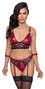 Bralette plus majtki do pończoch marki Cottelli BONDAGE w kolorze szlachetnej czerwieni, z delikatnymi wstawkami z czarnej koronki i metalowymi elementami w kolorze srebra. Bralette uwodzi rozcięciem w miseczkach, które można szybko otworzyć dzięki zatrzaskom. Ramiączka i pasek pod biustem są regulowane dla optymalnego dopasowania. Dzięki zatrzaskom majtki można również rozpiąć od mons veneris do góry. Po bokach i z tyłu zamocowane są pierścienie, przez które można przeciągnąć dwa dołączone paski na kostki (zapinane na rzepy). Paski na pośladkach są regulowane i można je nawet całkowicie odpiąć.