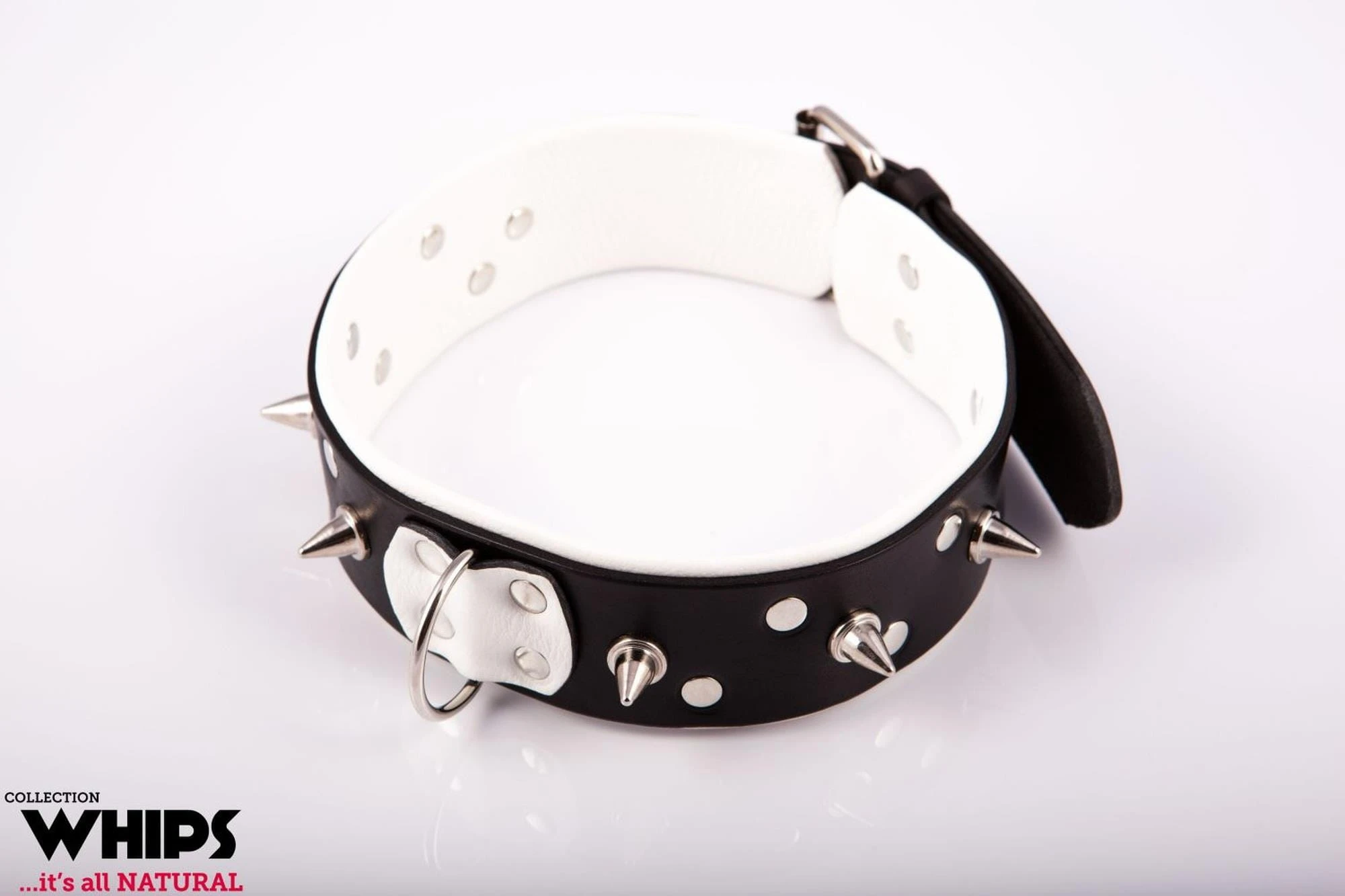 Skórzana obroża męska w kolorze białym, nabijana ćwiekami.