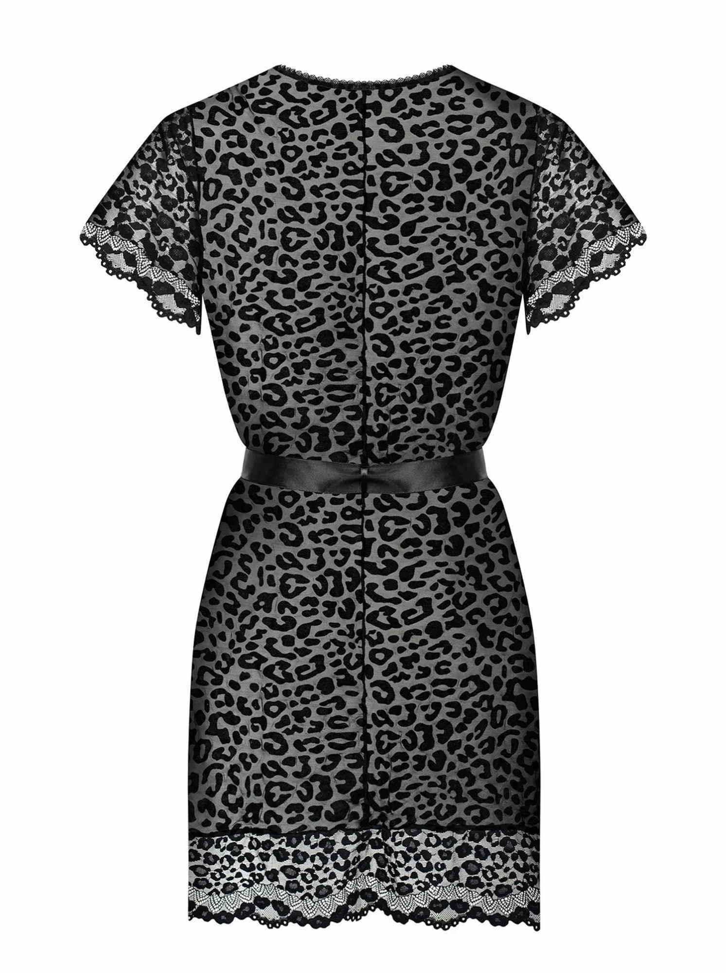 Dziś spełniamy Twoje fantazje. Peniuar Giully to miękka koronka i seksowny, cętkowany wzór. Pięknie podkreśla nogi, dzięki odpowiedniej długości za pupę, do tego czarna koronka o pięknym wzorze, rozkoszne cętki i niewiarygodnie wygodny krój… Zamknij oczy i wyobraź sobie zjawiskowo zaznaczoną talię oraz zmysłowo prześwitującą przez cienki materiał skórę. Gotowa, by go wypróbować?