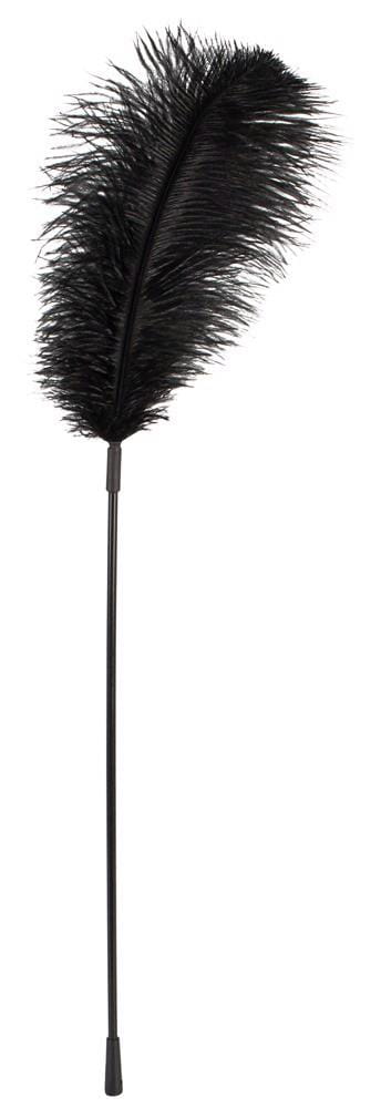 Duże czarne pióro na długim plastikowym patyczku.