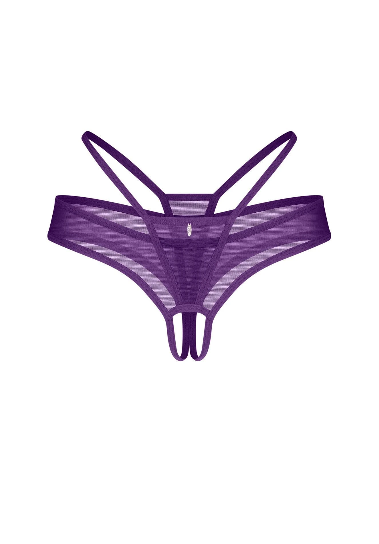 Fioletowy string bezkroczowy wykonany z delikatnej, przezroczystej siateczki w intensywnym, nasyconym odcieniu. Wielowymiarowy, paskowy design podkreśla biodra i pośladki, a srebrny charms z przodu dodaje subtelnego, a zarazem wyrazistego akcentu.