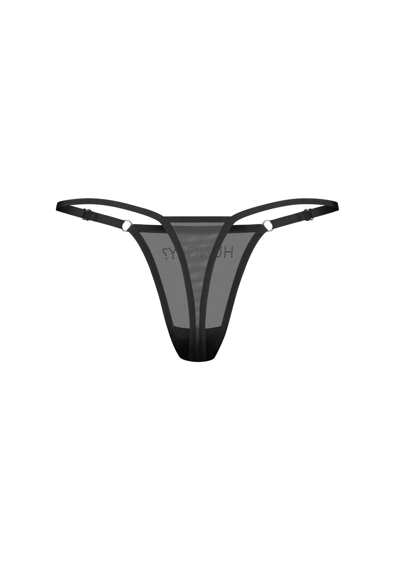 Czarne stringi z transparentnej siateczki z napisem z cyrkonii „Hungry?”