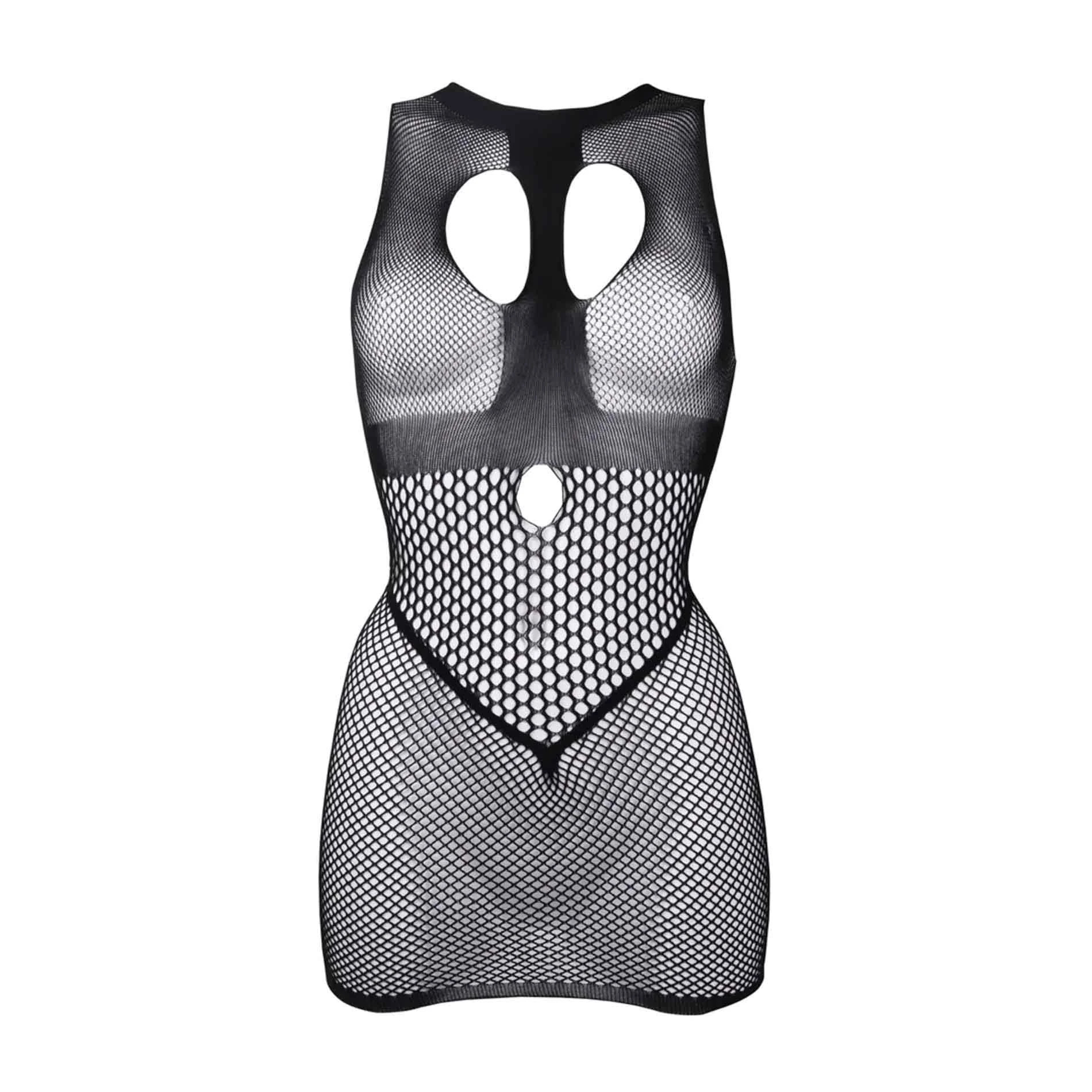Zmysłowa mini sukienka z wysokim dekoltem, wykonana z połączenia siateczki i wzoru fence net. Wyjątkowy nieprzezroczysty detal w formie chokera można nosić zarówno w wersji z otwartymi miseczkami, jak i z zakrytym biustem. Dodatkowo nieprzezroczysty akcent w kształcie litery V pięknie podkreśla talię, nadając sukience zmysłowego charakteru.