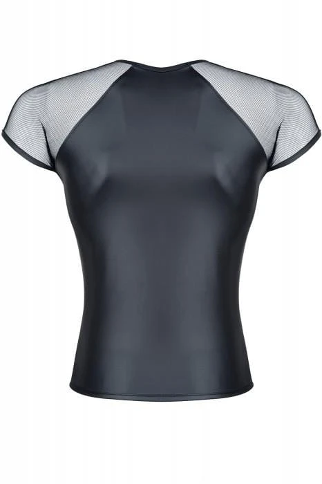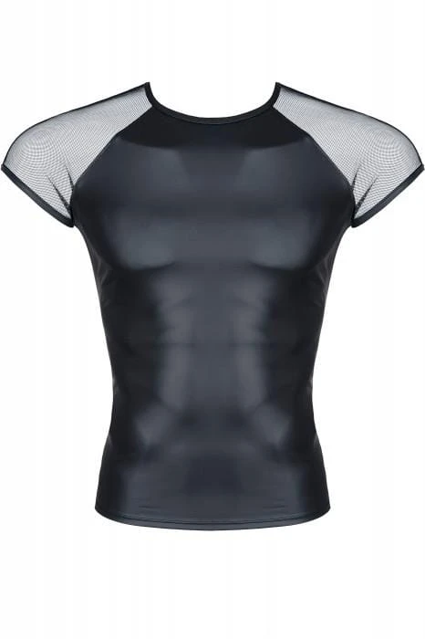 Stylowy męski t-shirt wykonany z elastycznego materiału typu wetlook, który efektownie dopasowuje się do sylwetki i podkreśla jej atuty. Korpus koszulki z elastycznej ekoskóry nadaje całości wyrazistego charakteru, natomiast rękawki wykonane z elastycznej siateczki subtelnie eksponują barki i ramiona, podkreślając męską linię sylwetki.