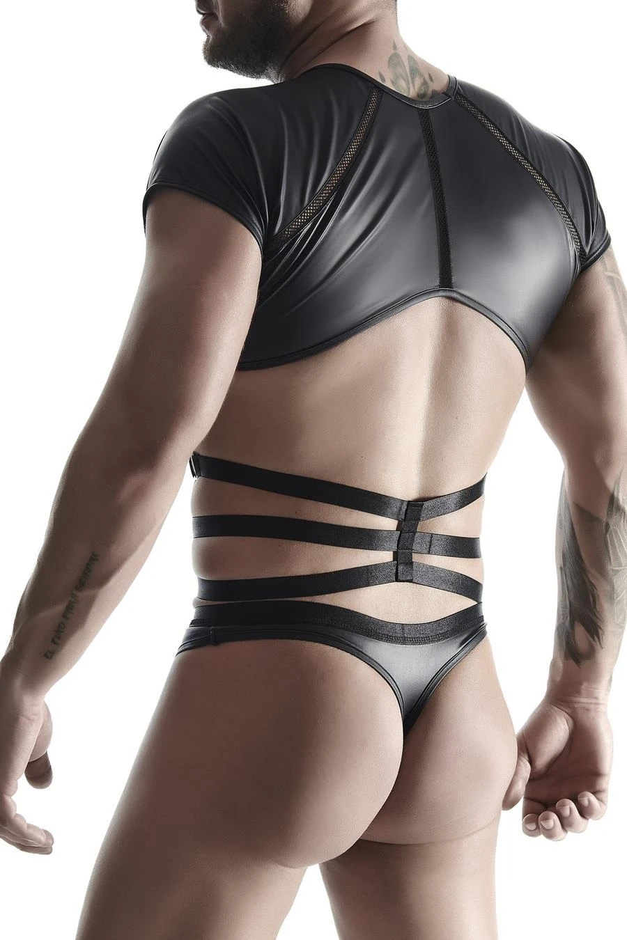 Opis produktu: koszulka z krótkim rękawem i dekoracyjnym elemenetem z czarnych gumek i srebrnych metalowych kółek / w górnej części z przodu i tyłu ozdobne pionwe wstawki z krateczką / czarne gumki z połyskiem, trwałe i miłe w dotyku / wzmacniające przeszycia / podkreśla kształt ciała 95% polyester / 5% elastane