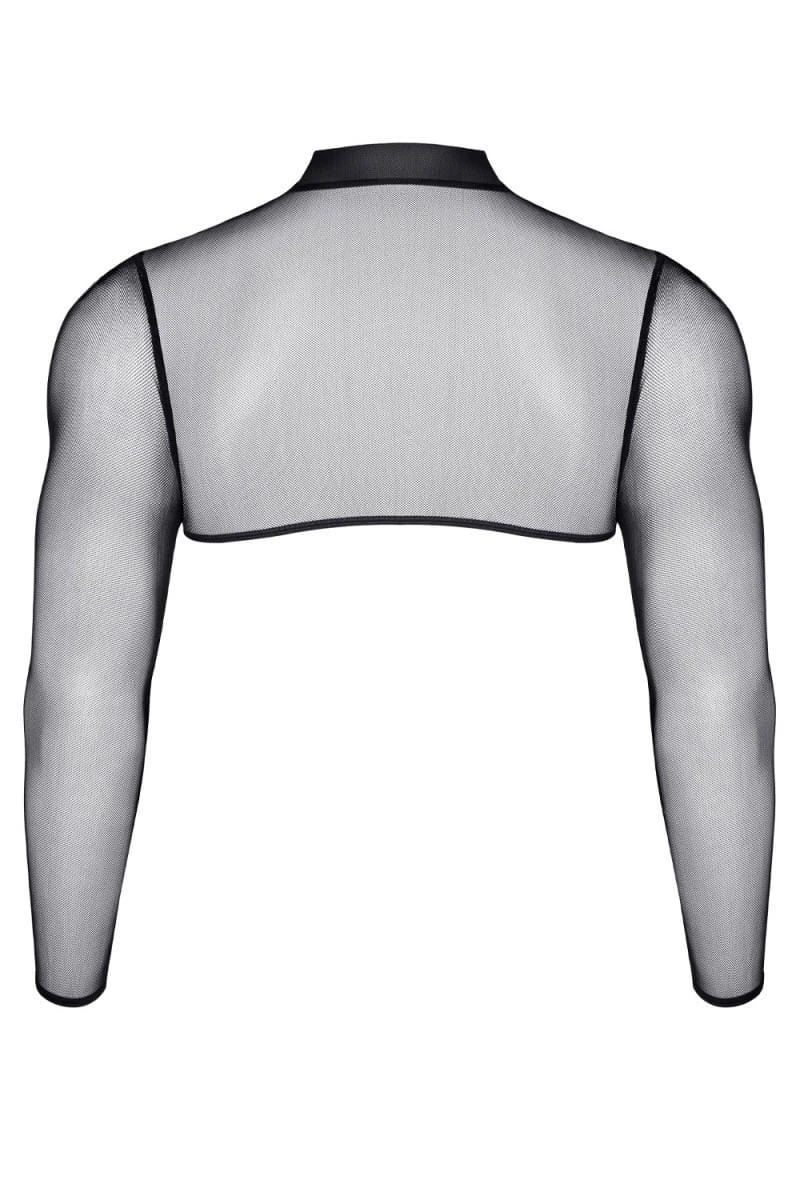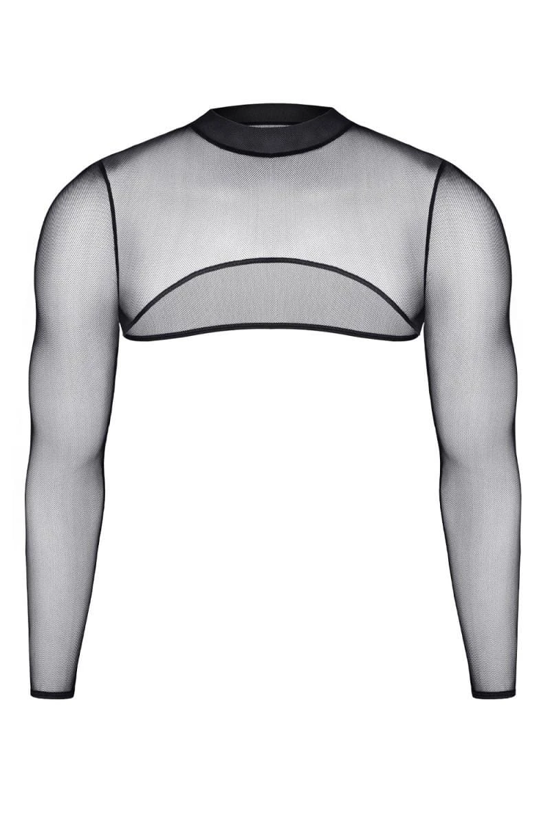 Krótki, odważny top wykonany w całości z wyjątkowo elastycznego, sprężystego czarnego tiulu, który perfekcyjnie dopasowuje się do sylwetki. Fason optycznie poszerza barki i podkreśla klatkę piersiową, jednocześnie efektownie eksponując plecy oraz brzuch.