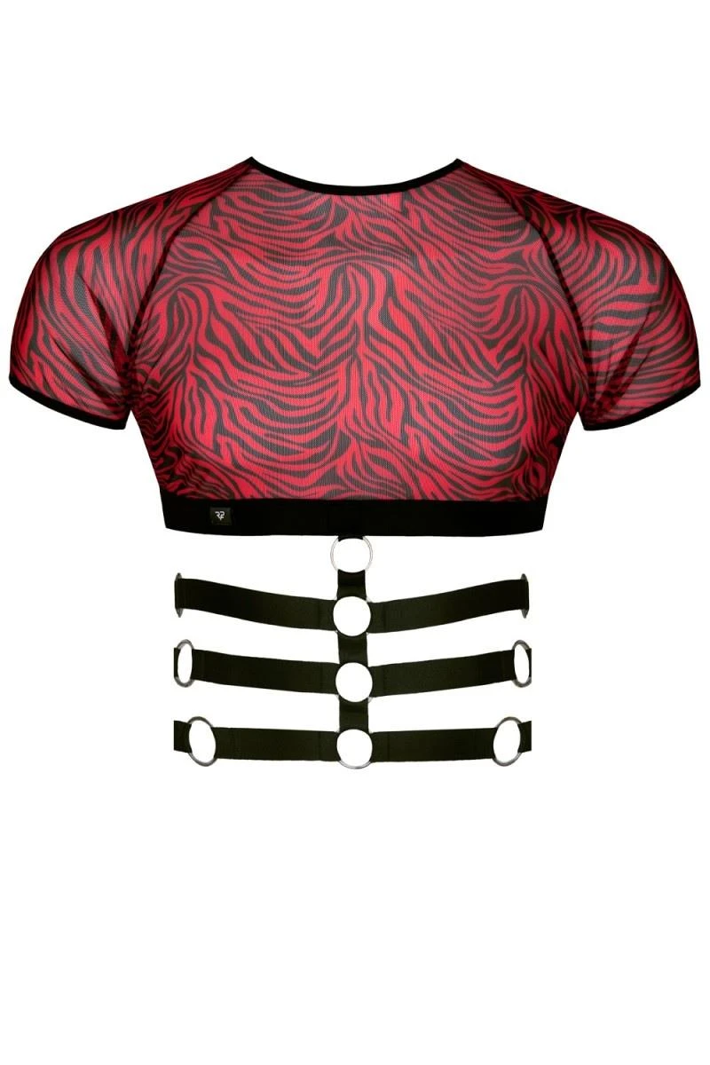 Górna część wykonana z elastycznego i sprężystego tiulu w czarno-czerwony wzór zebry zmysłowo podkreśla klatkę piersiową oraz linię barków, nadając sylwetce wyrazistości i charakteru.