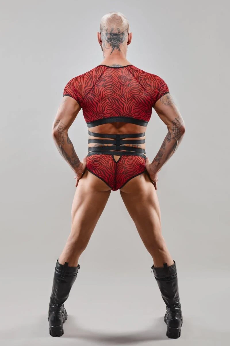Górna część wykonana z elastycznego i sprężystego tiulu w czarno-czerwony wzór zebry zmysłowo podkreśla klatkę piersiową oraz linię barków, nadając sylwetce wyrazistości i charakteru.
