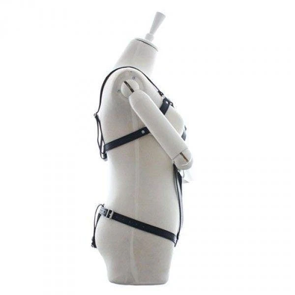 Czarny strój Fetish Art by Toyz4Lovers wykonany jest z miękkich, elastycznych pasków pokrytych delikatnym materiałem, które idealnie dopasowują się do ciała, podkreślając jego kształty. Z tyłu posiada zapięcie, a z przodu metalowe kółka, dodające mu zmysłowego, fetyszowego charakteru.